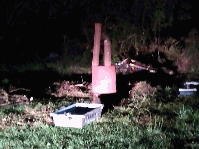 シーサイドビューから譲って頂いた古いボートを埋めて池を造りましが、ぼーふらが大発生しました。 そこで、水槽からの水を貯め、あふれた水をフェアーフェイに流すパイプを埋めて水が流れるようにしました。 水が汚れた場合はボートの底からも排水できるようにして、常にきれいな水が貯められるようにしています。
