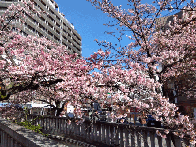 糸川の左岸側を下り右岸側を上って眺める200mほどの川沿いの桜は3分咲きで、色は河津桜に近い濃いピンクです。