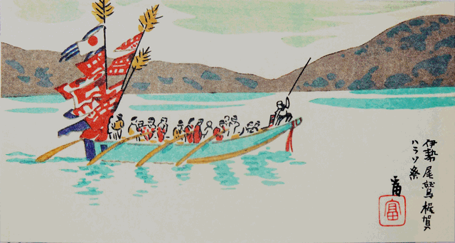 漁港に入ると『ハラソ!ハラソ!』の掛け声とともに大漁旗をつけたハラソ船で鯨を追い、もりで射止めるしぐさを行います。
